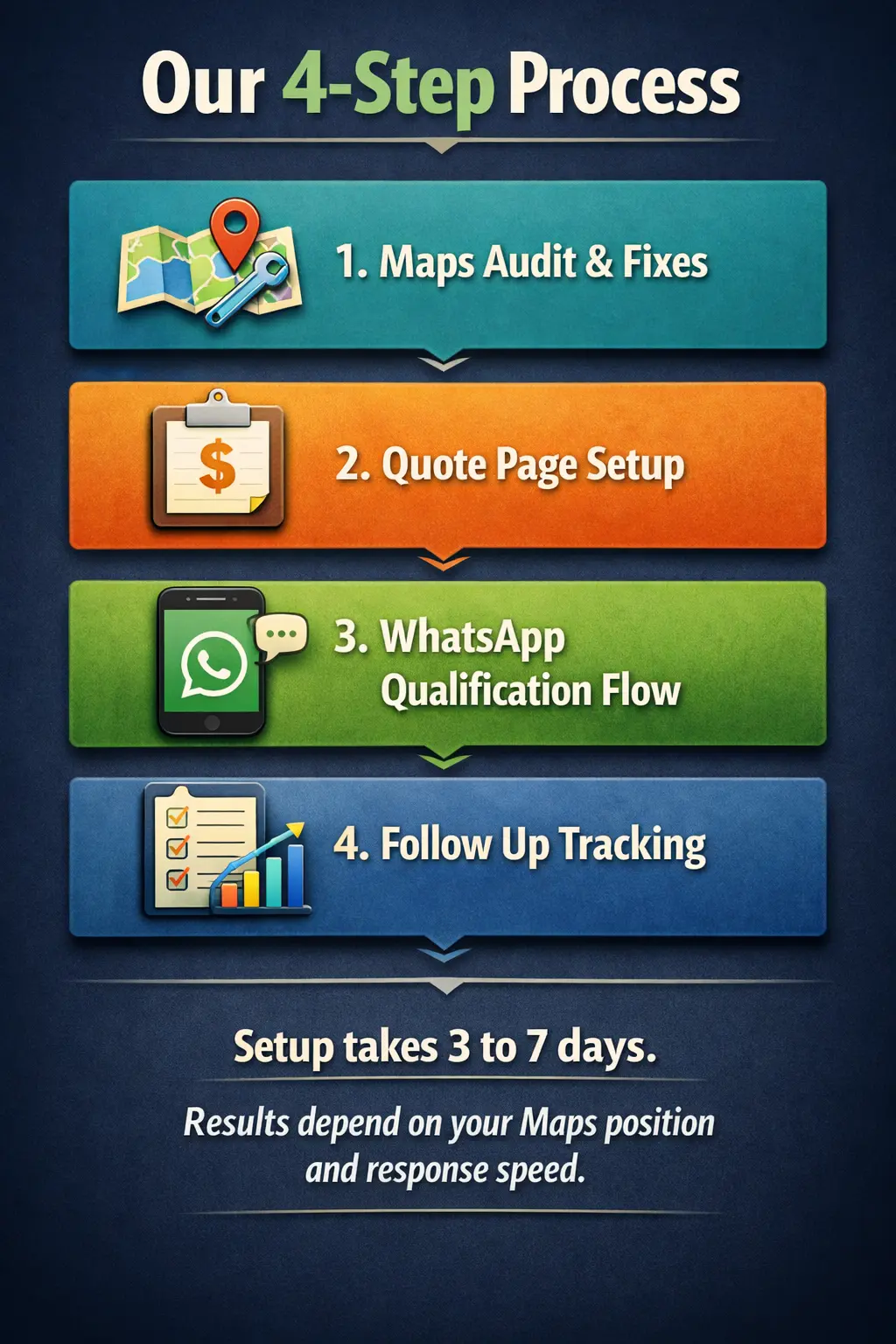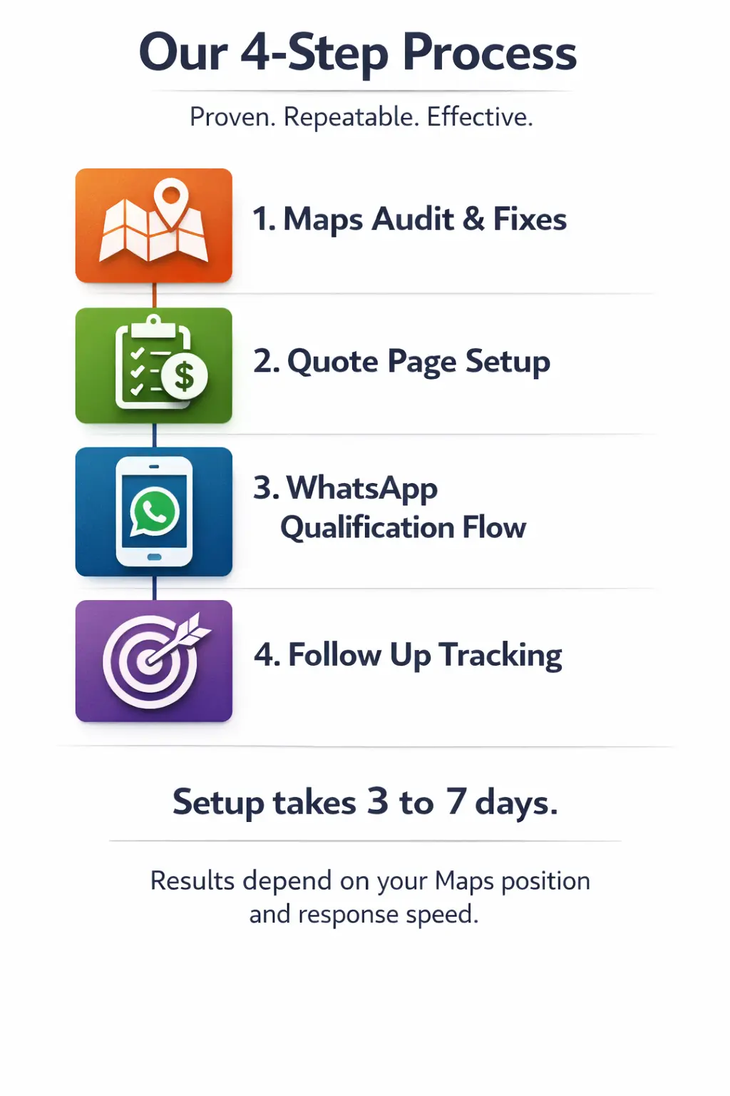 Google Maps optimization, quote page setup, WhatsApp qualification flow, and structured follow-up system built to convert inquiries into site visits.